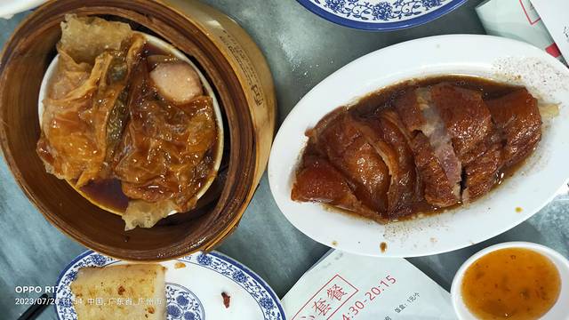 我点的套餐里,有一大碗皮蛋瘦肉粥,真的好大一碗,笋尖虾饺味鲜美,但是还是有些欠缺,柠檬陈皮炖老鸭汤很入味, 天山雪莲炖鸡这个就比较容易腻。两人都点了糯米鸡。