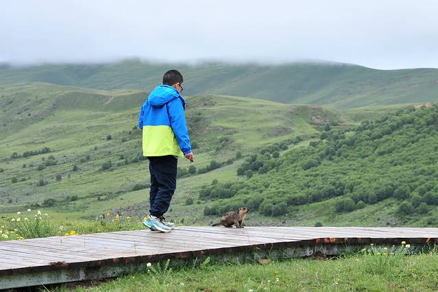 在仁康古街短暂停留之后,我们去往下一站:毛垭大草原。上午十点多从理塘西城门出发,路边草原开满了密密麻麻的各色小花,土拨鼠趴在洞口四处张望。到达毛垭草原时,已近一点,午饭没着落,娃有点不开心。紫外线很强,风也大,小花虽好看,娃却怕踩到牛粪,也怕被牛蝇叮咬,旁边一对夫妻支着天幕在煮饭,不远处有几个少年在游泳,肚子好饿只能先吃点零食充饥了。