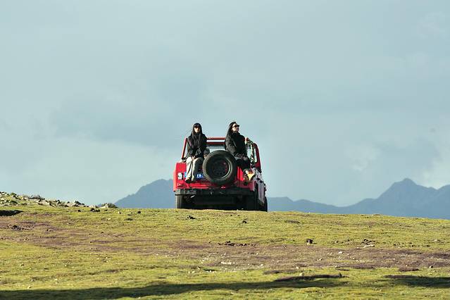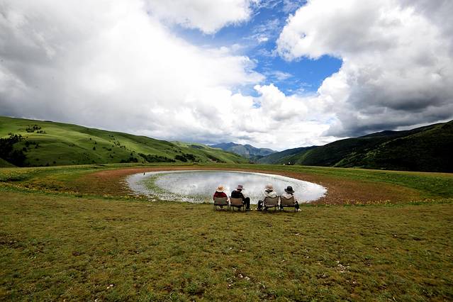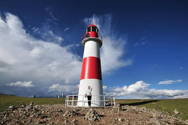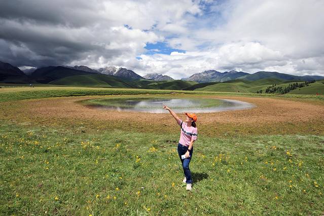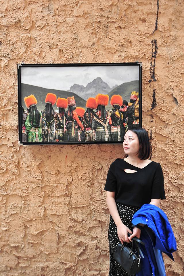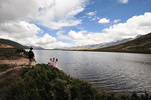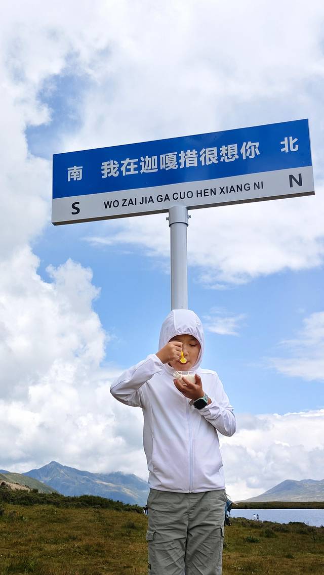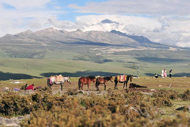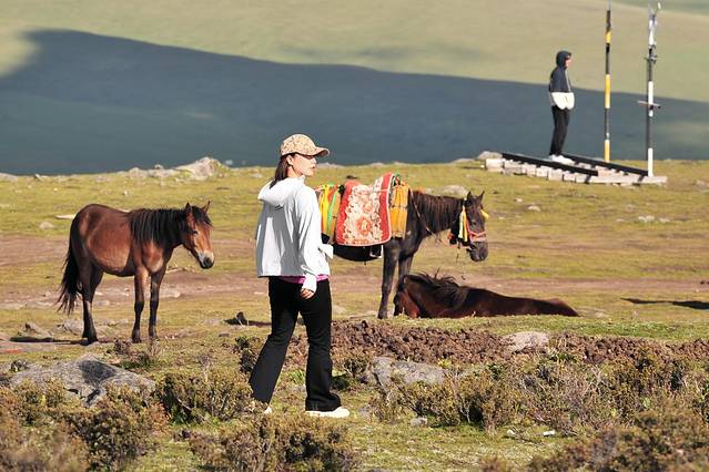 沿着434继续往前,17:20,走了好几公里盘山碎石路,上到了格底拉姆,此处需收取20元/人的卫生费。上面放置了一些用于拍照的道具,有阳光的下午,拍照非常适合。