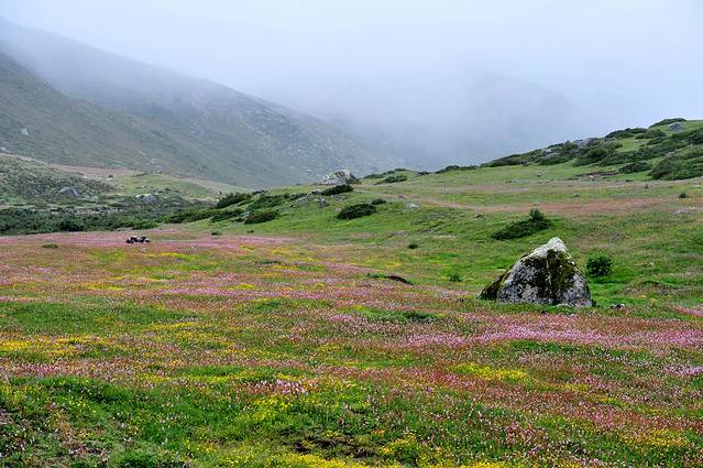 巴塘到波密乡路上的小花很浓密,但因一直下雨,我们只拍了一处照片,很遗憾!