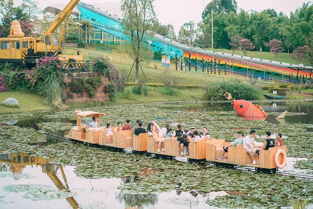 千寻的火车:是在湖上面开的水上火车,湖里开满了睡莲,有一个大吊车在钓金鱼,仿佛在千与千寻的梦幻世界穿行~
