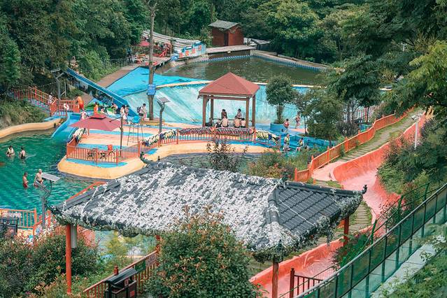 有水上乐园,呐喊喷泉、彩虹大道、花海秋千、疯狂动物城、重返侏罗纪、天空之镜、欢乐溜索、沙滩探险、超级秋千、丛林穿越、极速滑草、高空秋千、步步惊心桥、天空自行车、欢乐云、森林小火车……等等,有大部分是包含在门票里的,有小部分需要另外付费,水乐园位于山谷之间,大小游泳池、刺激的水滑道、山地滑水,耍起凉快得很!