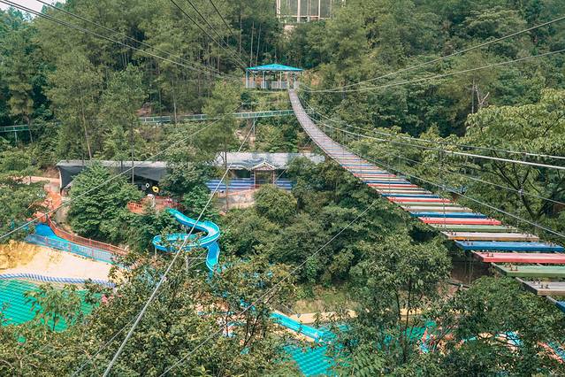 喜欢刺激的可以去高空挑战专区, 比如 步步惊心吊桥,脚下就是数十米的深谷,每一次桥面的晃动,都能令你毛骨悚然;也可以体验这里的水上飞索,从百米高空呼啸而下。