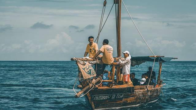 就是上图这样的木帆船,在纯净的海面上迎着太阳随风而动。