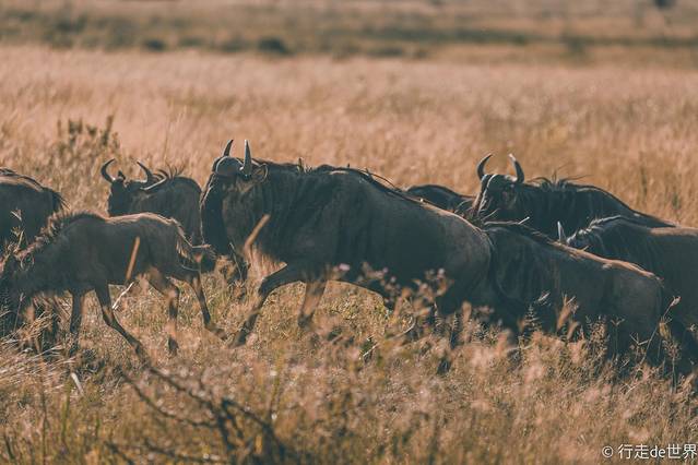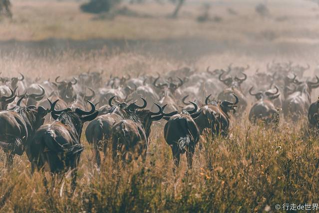 成群的角马在自由的奔跑,尘土飞扬的壮观景象大概只有在塞伦盖蒂才可以看得到。
