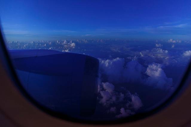 继续向着南半球飞行,飞机会跨越多个时区,眼前的景象也会随之变化。刚刚还是大片漆黑的夜空,转眼间就已经变成了无滤镜的橙色,再一不小心就进入了暗夜模式。还没有来得及适应黑暗,飞机的舷窗外又是一片蔚蓝,蓝的让人不敢相信这是真实存在的情形。