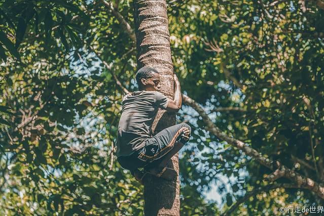 一个小哥快速的爬到旁边的椰子树上,几分钟的时间大家就有口福可以品尝到最新鲜的椰汁。
