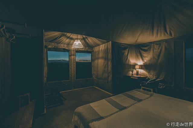 房间的每个方向都可以打开,完全躺在床上就可以欣赏到周边不同的风景和动物种群。等到天黑的时候一定要把所有的帐篷拉链都拉好,要不然就会被各种不知名的昆虫袭击。夜里想要离开帐篷区域可以呼叫安保人员陪同,一般在不远的地方都会有一名持武器的安保人员可以陪同。
