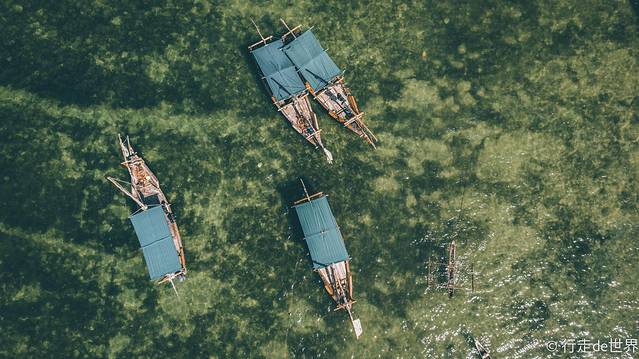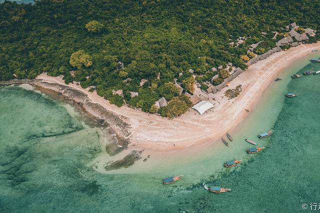 随着无人机的高度越来越高,画面里的沙洲开始变得让人为之惊叹,慢慢地开始发现这里好似一条海豚在大海中嬉戏,翠绿色的海水和洁白的沙子形成鲜明的对比,还有蓝色顶棚的木帆船,每一个细节都是那样的引人入胜。