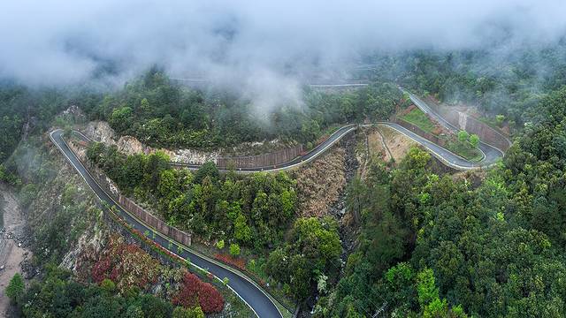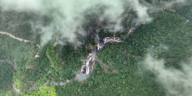 百杖潭瀑布以崖险、瀑高、潭深、水清、溪曲闻名遐迩。瀑布所在地势极为险峻,上下三瀑相连,谷中水声轰鸣,水雾弥漫,背日而站,但见彩虹横空,似进入人间仙境。