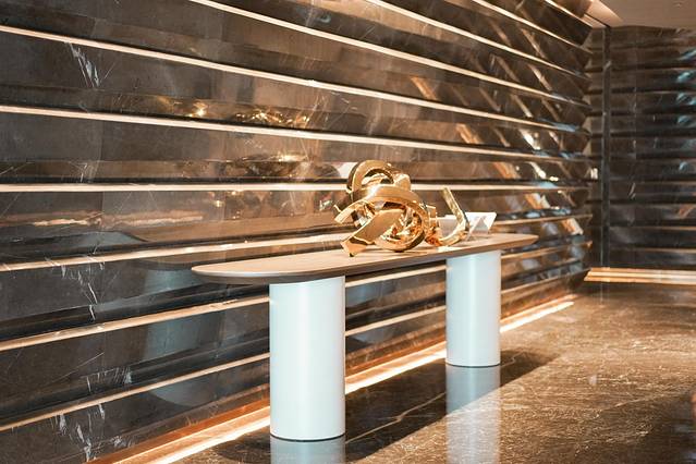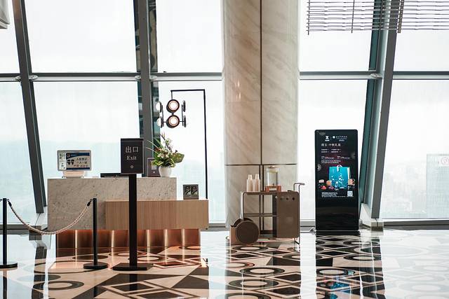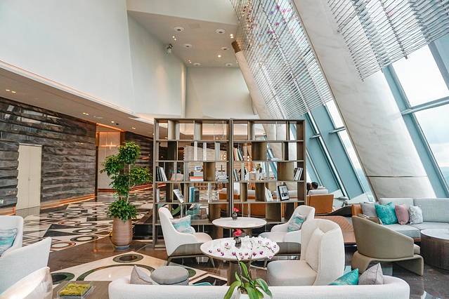 酒店大堂在46楼,360°全景落地窗的视野极其开阔,可以俯瞰窗外的繁华城景。大堂的设计的立柱、玻璃窗的设计都极具线条感,宛如延伸至天际的立柱,把几何空间美学展现得淋漓尽致,时尚又雅致。如果天气好,蓝天白云就在眼前,阳光还会透过玻璃窗洒满整个大堂,璀璨又温暖。
