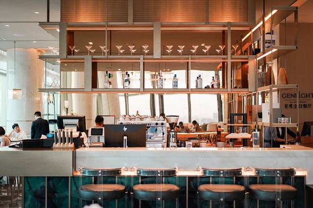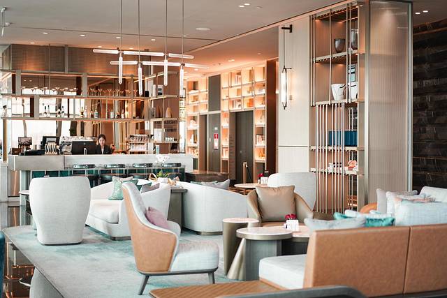 同在46楼的大堂酒廊也坐拥天际景观,是小憩休息和社交的悠闲好去处。大堂酒廊不仅有咖啡和特色下午茶供应,还有宾客提供世界闻名的威土忌酒和琳琅满目的鸡尾酒。闲暇时分,在大堂酒廊一边品尝美味的咖啡,一边欣赏窗外都市繁华景色,静享高品质的慢生活。