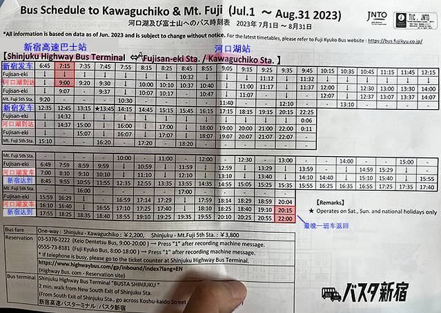这是新宿站与河口湖站之间的巴士时刻表