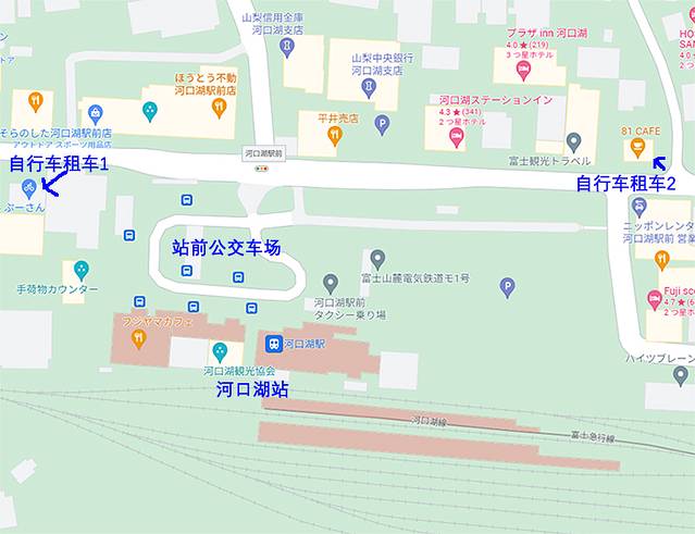 河口湖站是铁路和巴士一起的综合站,自行车骑行的话可以在附近两处租到自行车(普通车租一天2000日元左右,相当于rmb100元,租电助力车会贵一些但是骑着更轻松)。81cafe也可以租自行车,里面服务员是两个小姐姐和一个小哥哥都很可爱。自行车租赁点就在河口湖站附近,位置见附图