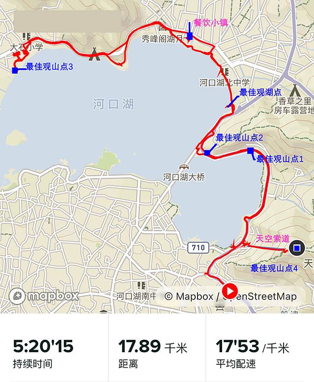 环湖线往返17公里,主要有四处观山、湖拍照点、一处餐饮小镇还有一处山顶鸟居及瞭望台(有缆车可以上山),都是最经典的拍照打卡的位置,见附图