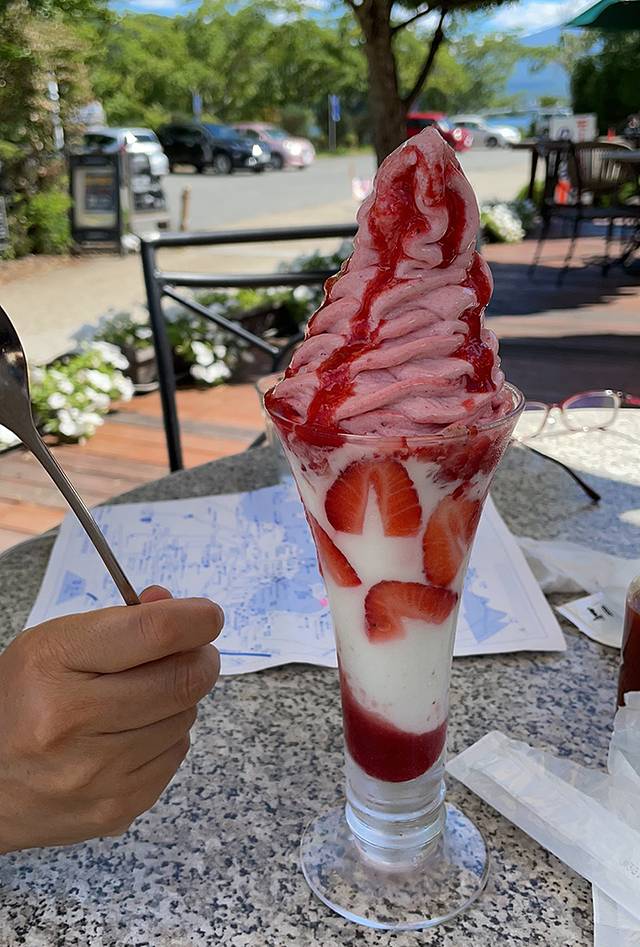 骑行路线主要分两条,一条是环湖路线,一条是浅见公园及网红街路线,如果时间充裕可以两条都走。我和老婆走的是环湖路往返17公里,算上吃中午饭和排队坐富士山全景缆车、大石公园赏花和购物一共5小时,骑车的优势是可以走景色优美的湖边观景路,随时停下来拍照,这是汽车不能比拟的。
