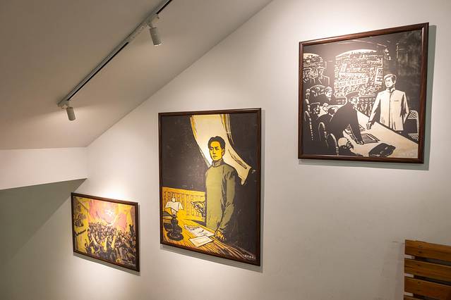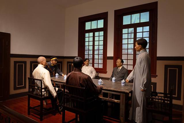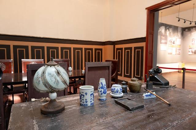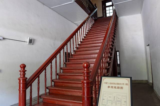大罢工谈判旧址,是一座红色的二层小楼,有简单的桌椅布置。