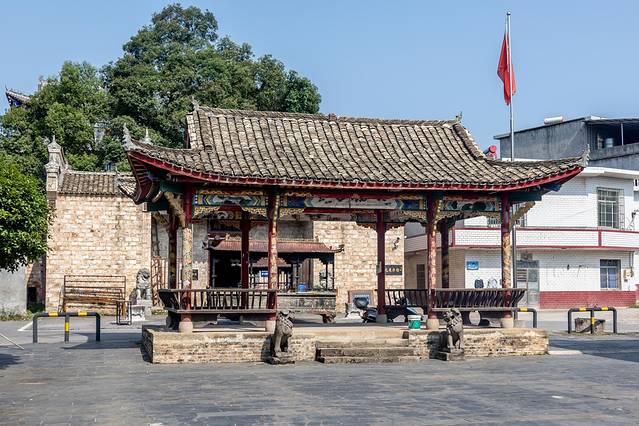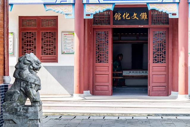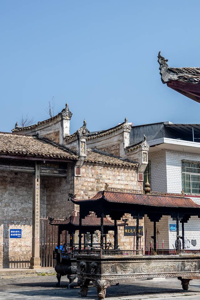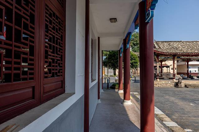 来到公祠前,抬头看到其墙面和屋顶都有翘角的挑檐,祠檐的四角呈弧形翘起,犹如孔雀伸长的脖子和头望向八方。四角上面安装的铜花历经数百年风雨侵蚀,至今光亮依旧,实属奇迹。