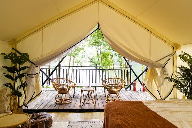 玩累了以后、不想再奔波回家,还可以到湖心岛造浪乐园附近的营地——星辰山海营地住上一晚,吃饭入住一站式服务,野奢风十足的帐篷同样能让人感受到户外活动的乐趣,有种远离城市、偷来浮生半日闲之感。