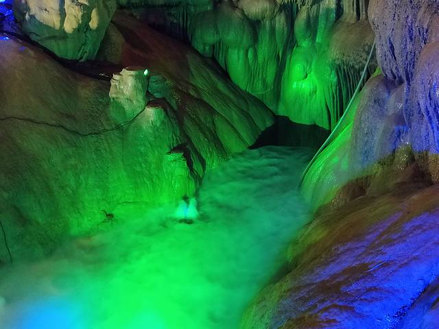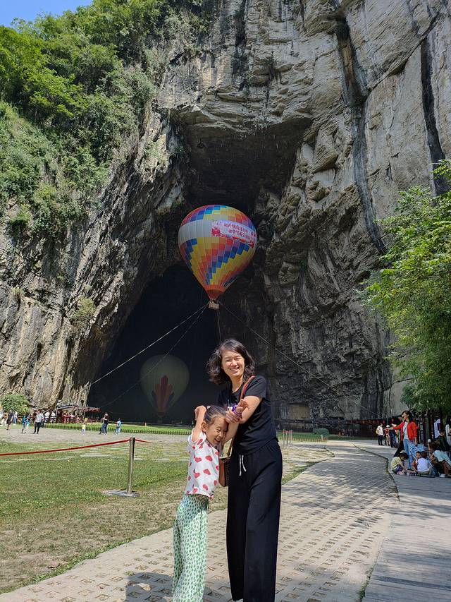 腾龙洞,游客中心在利川市区,如果选择停车在游客中心,则需要购买22元的来回大巴车票,乘坐大巴车约十分钟到达腾龙洞门口。也可以直接驾车到景区出口处的免费停车场,这里有二三十个停车位,但今天我们快十一点才到,已经没有位置了,只好停到几百米远的一个农家乐路边停车场,还好没人管也没人收费。从大门进入会先经过“双龙戏水”的洞口,然后再去往主洞口。这时你就会看到两个硕大的热气球在等待游客乘坐,大人140元,1米4以下的儿童100元,从开始上升到落地也就五六分钟时间,真心贵啊,不过娃儿真心想体验,恐高的我只好舍命陪君子,在上升的途中真的是双腿发抖。体验完热气球进入洞口,可以选择10元的往返电瓶车(单程同价),也可以选择步行,路标显示到激光秀广场的距离是3.5公里,但个人感觉没那么远,坐车拐两三个弯就到了。下电瓶车后可以步行百来米到激光秀广场,也可以选择坐每人25元的飞天魔毯-16分钟前行不到百米的一个坐的电梯!!!比走路还慢!到达激光秀广场十二点半,我们就等待看下午一点的激光秀,二十分钟的节目,讲述了神龙和土家族妹子的一段悲欢离合的感情故事,这或许就是腾龙洞名字的由来吧。激光表演结束后,我们又继续朝后洞游览了一圈回到激光秀广场。这段路确实是太冷了,幺儿已经冷得需要我们抱了。返回激光秀广场,我们又乘坐电瓶车出洞口,途中会经过歌舞表演地,可以选择下车,但我们考虑到这里上车一般都没有座位了,加上时间有限,所以就直接选择到洞口。出了洞口走个十多分钟就出景区了,总共用时三个小时,如果时间允许、衣服允许(后洞那段确实太冷了),多玩个两三个小时估计也行的,哈哈。