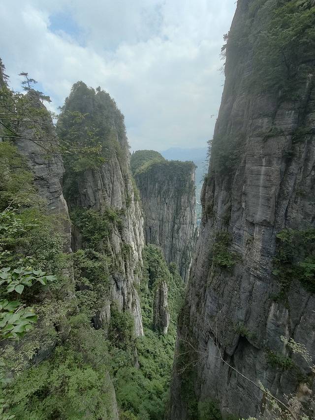 早上八点早饭过,由酒店工作人员开一辆老款GL8将我们送至恩施大峡谷游客中心的一个小路口子。(据所有消息反馈,如果自驾到游客中心停车场停车后,还需要步行十五分钟穿过一条商业街才能到达售票检票大厅,距离远而且不方便,而酒店送我们进去的这个口子,只需要爬百来步梯子就可以到达售票大厅门口了,着实方便得多。同时从景区游玩结束后直接从索道下站的一个小铁门就可以出景区了,不用再乘坐地面缆车返回到游客中心再走路去停车场,当然,这前提是你住的地方得在索道下站那附近才合适)由于我们是昨天买票,虽然门票两日有效,但今天再次进去还是需要先到大厅二楼去改签下才能继续进入,人不多,几分钟就搞定。检票进去后,先乘坐地面缆车到索道下站-也就几百米,三五分钟的事情。注意:恩施大峡谷两个景点-七星寨和云龙河地缝,均需要先检票进入后先坐地面缆车到索道下站。到索道下站后,如果去游览地缝景区,直接按照地缝的导航箭头去就行了,全程就是在峡谷栈道行走,大概三五公里后到达垂直观光电梯,可以选择坐电梯(30元)或者步行上到地缝顶端(相当于这个观光电梯只是给走路走累的人多一个不用爬楼梯的懒惰选择),然后再步行回到索道下站,至此地缝景区就算游览完毕了,时间基本不会超过两个小时。今天我们游览七星寨景区,我们就需要在索道下站先乘坐索道到山顶的索道上站(不能全程步行上山,如果不坐索道则需要在索道下站先乘坐景区大巴车到半山腰的步行道起点,再步行到达索道上站),然后在绵延三四公里的平缓山路上行走约两三个小时,途中会经过绝壁栈道、一炷香、母子情深等景点,其实也就是不同造型的山石景观。最后到达扶梯处,可以选择乘坐手扶梯下山(30元)或者继续步行下山。扶梯尽头就是大巴车乘车处,在这里均需坐大巴车返回索道下站,至此七星寨景区游览就算结束了。整个七星寨景区就一条路,一般都是从索道上站开始步行往手扶梯方向走,至少我今天没有看到往回走的人,也不知道索道是否可以往下乘坐。整个大峡谷,怎么说呢?想象中是在峡谷底端望着天空的峡谷一路前行,结果只有地缝景区有这种感觉,但地缝的高度大概不到一百米,没有给人很震撼的感觉,而七星寨就彻彻底底是在山顶沿线行走,似乎整个大峡谷景区,和大峡谷三个字并不是特别沾边。值得一提的是,从更宏观的视角来看,大峡谷景区的大幅崖壁,与周围同样震撼人心的崖壁,将中间沐抚镇所在的一座山峰围成了一圈大尺度天坑壁,你站在大峡谷景区里面向整个周边放眼望去,还是会对大自然的鬼斧神工由衷感叹!我想,这才是恩施大峡谷的真正内涵所在,而不仅仅是一个大峡谷景区这么简单。