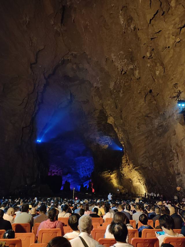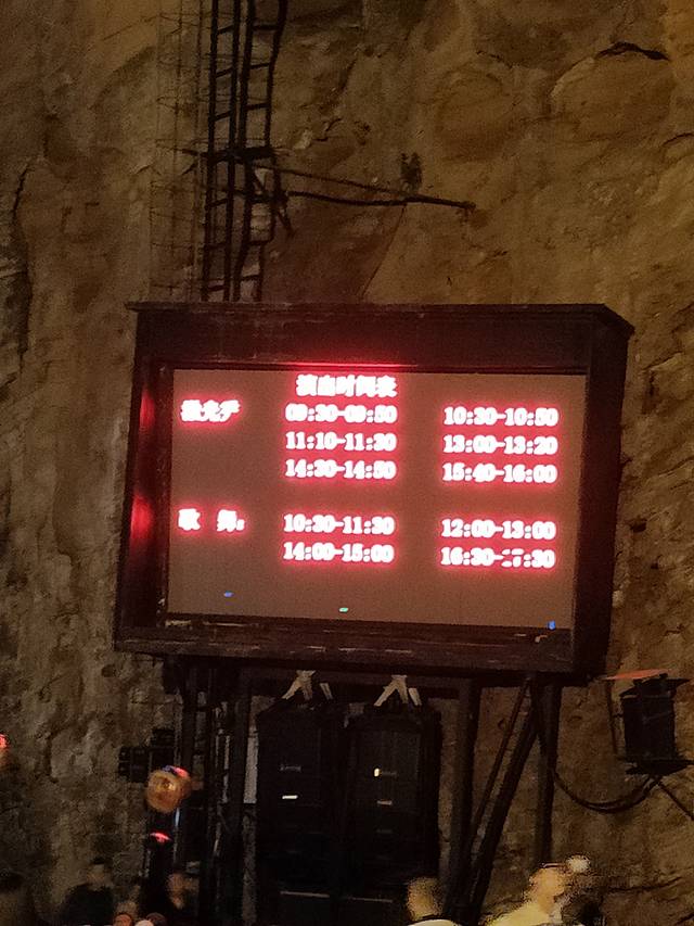 早上慢悠悠的起来,到酒店楼下吃了当地10元一碗的鸡杂面,价格便宜味道合适。酒足饭饱,再慢悠悠的驱车前往今天的旅游目的地-腾龙洞。据说这是亚洲最大的溶洞,进去后在主洞口有两个热气球可以乘坐,进入洞口可以选择乘坐10元来回的观光电瓶车,也可以全程步行游览,半程中有一个歌舞表演,终点处有一个激光秀表演,演出每天都有固定的几个时间段(见图)。150的门票,感觉还行,主要胜在大,洞体空间确实大,高度估计有一百多米吧,毕竟都能在里面修路让电瓶车开的,不过洞穴本身的观赏性就不大了,没有雪玉洞等那种传统洞穴景观的各种溶岩形态,腾龙洞更多给我的感觉是提供一个场所让你进去体验各种游乐项目,但里面确实凉快,甚至有点冷,特别是从激光秀广场再往里的后洞步行走一圈的时候,让身穿短衣短裤的我全身发冷,媳妇娃儿也说冷得很,还好从激光秀广场往外走后,温度就比较适宜了。