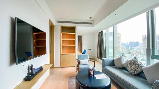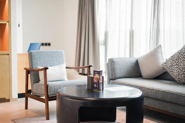 房间内是简约干净的莫兰迪色调,风格简单明亮,布艺沙发和木色地板清素典雅,每个房间都是大落地窗,城市风光可尽收眼底。客房内使用的是好梦常在™睡眠体验床,风格简约,床品舒适,灯光温暖,让人宛如回到了阔别已久的家,可以尽情放松,舒适入眠。