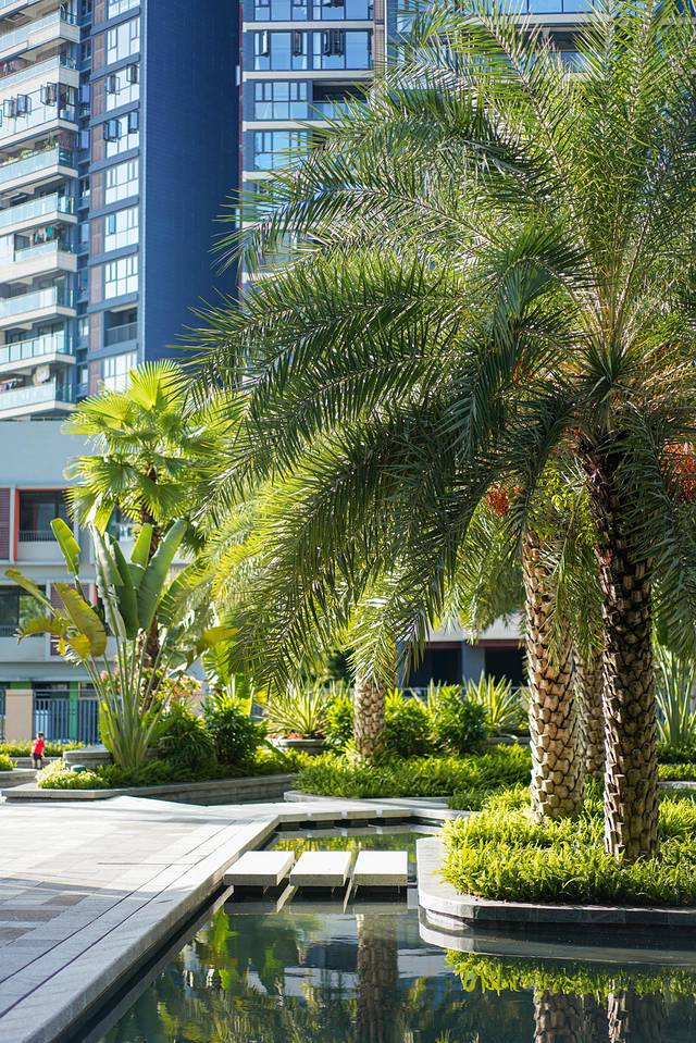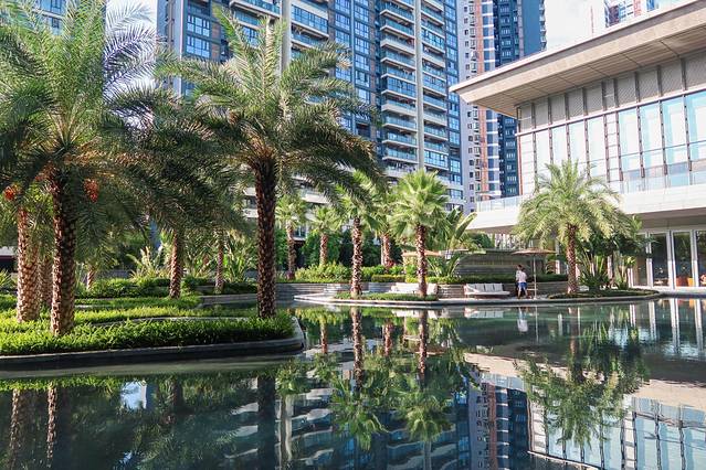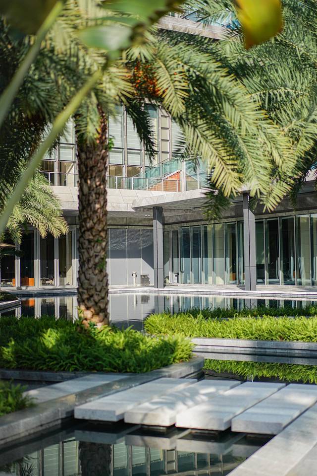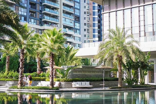 到达酒店后,第一眼就被酒店中庭庞大的热带雨林池畔花园所吸引。户外花园绿植簇拥,水池环绕,充满着度假风情,阳光下粼粼的波光反射在热带植物上,带来别样的视觉享受,可谓城市钢筋水泥中难得一见的秘密花园。漫步其间,绿意盎然,微风轻拂,让人心情愉悦。