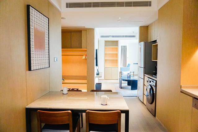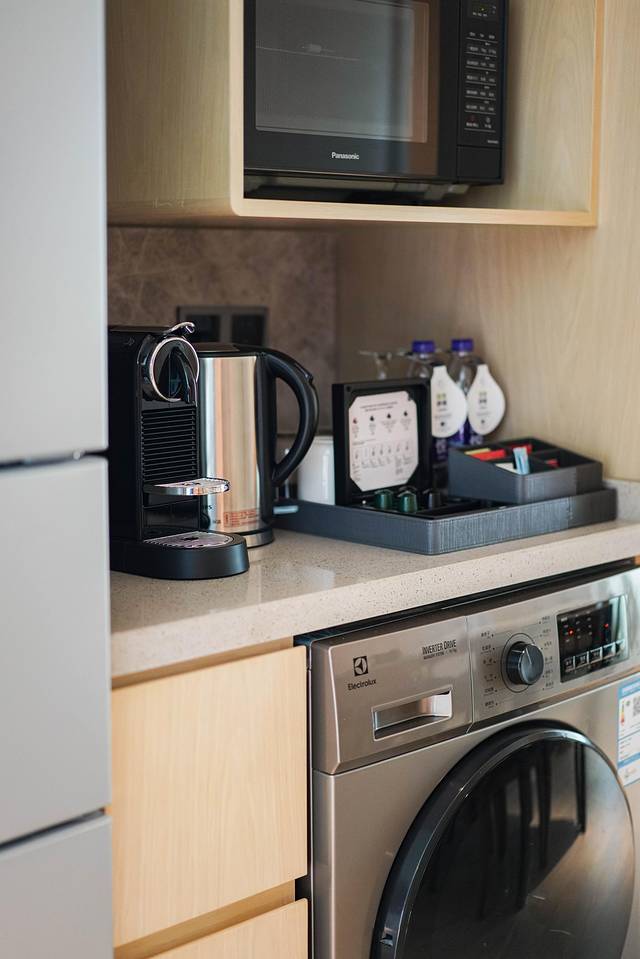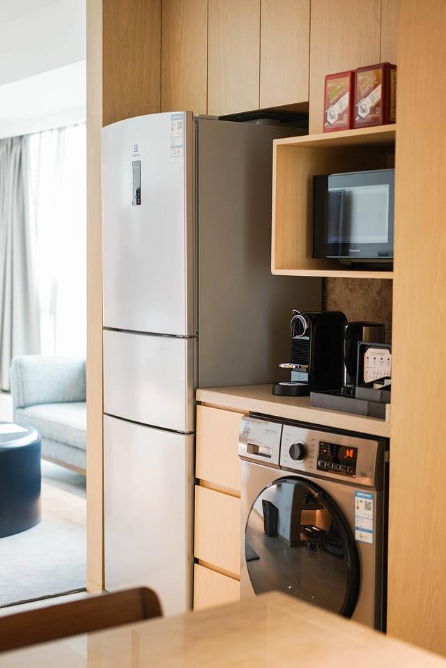 公寓内还设有独立厨房,配备了高端品牌的家具和设备,微波炉、洗衣机、咖啡机、电热水壶等等,每一样家电配置都兼具实用性和便利性,无不体现希尔顿逸林对宾客暖心关怀的服务和暖逸舒适的贴心照顾,适合短住,也很适合长租。