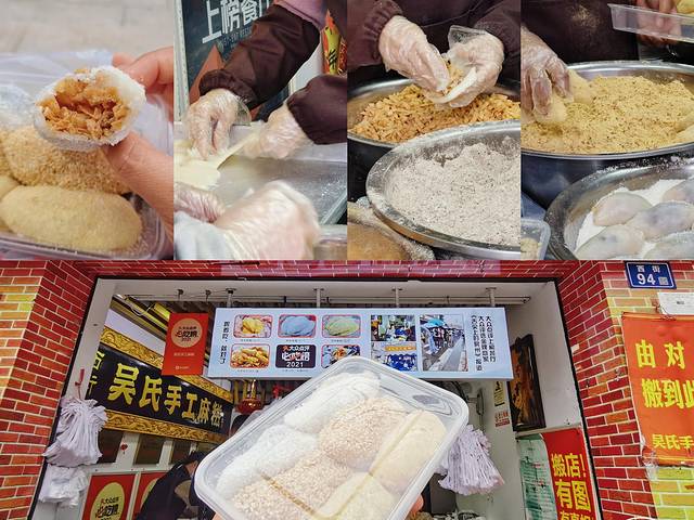 麻糍是纯手工做的,蒸熟的糯米粉揪一块包上馅,再裹上豆面或椰蓉。里面有油炸脆的馓子,不易久放。
