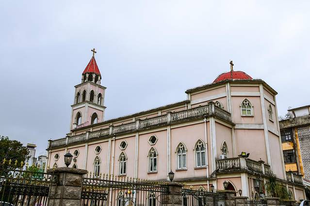 泉州 多种宗教兼容并存,各种寺、庙、堂之类的祭拜场所特别多,只要看见红色古厝彩色琉璃瓦,房顶雕龙、八仙过海之类的题材基本都是祭拜场所。粉色天主教堂是比较特殊的存在。可惜室内不能参观,室外可拍照。