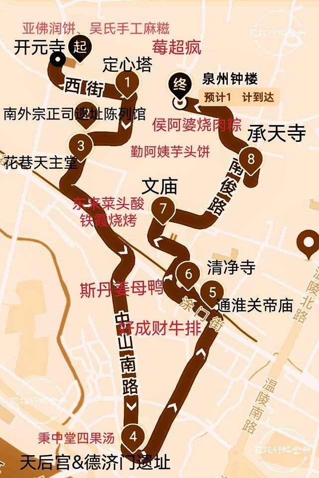 用脚步给 泉州 地图画一条项链,10个经典景点,不止10家小吃店,2万步+逛、吃、逛、吃,附路线图,值得尝试!景点多集中在鲤城区,距离多在千米以内。花巷天主堂☞天后宫☞关帝庙可乘小白,单程2块。除了清净寺门票3块钱,其他景点免门票,免预约。吃饭花费丰简由己!