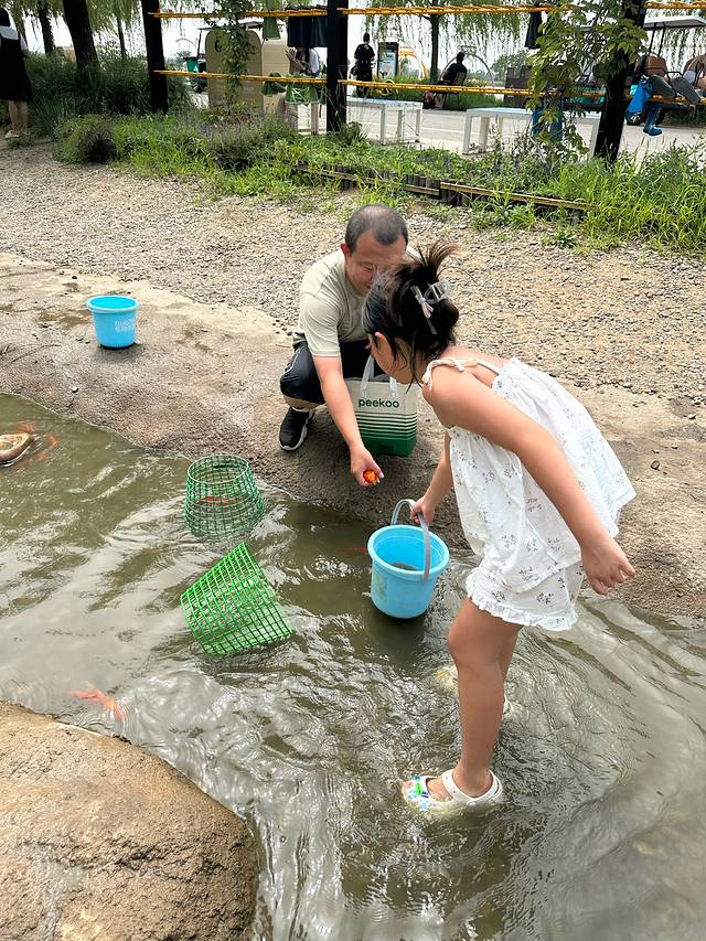 这个区域小朋友超多,小溪里都是红色的小金鱼,进门处取工具就可以到小溪里捕鱼了。