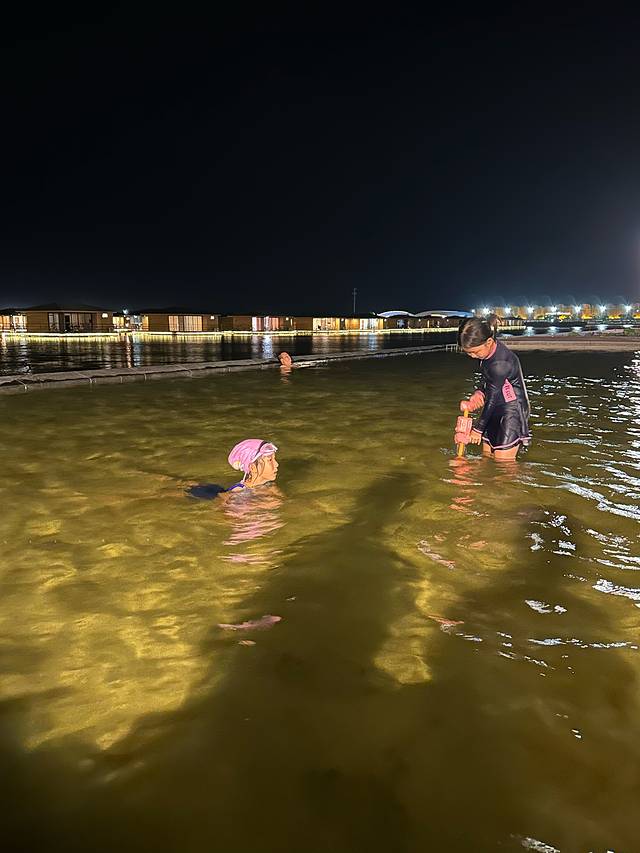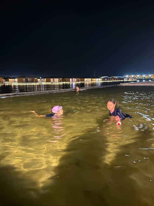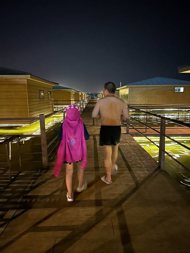 晚上的水感觉很暖和,可是从水里一出来就又特别的冷,所以一定带浴巾啊,白天的时候浴巾没用上因为一出来也是太阳晒着不觉得冷,晚上出来我没想到会冷,就直接穿着泳衣出来了,结果冻的不行!