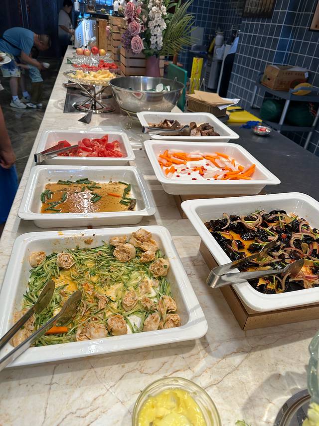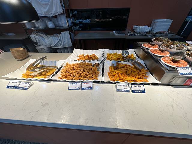 虽然我们自备了食物,但是还是进餐厅里看了一圈,有一个海鲜自助,看着地方不大,里面具体有啥不知道,128一位。然后就是一个个独立窗口了,有面试,炒菜,汉堡啥的,种类可以说够多,价位基本上每份都是40元左右,感觉吃饱没问题!放几张照片大家自己大概了解一下就可以。