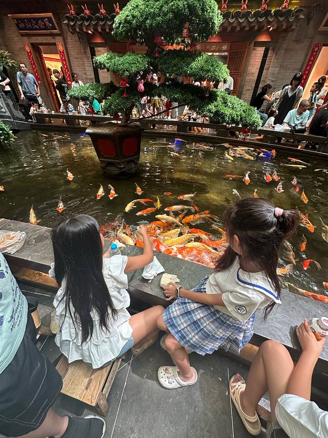 整个大堂的中间有个大池塘,里面好多的锦鲤特别漂亮,围着池塘四周都是座椅,供游人歇脚吃饭使用,当然肯定地方是不够用的,很多人都用小板凳坐在了水池边,一边吃一边看锦鲤也是很赞啊!