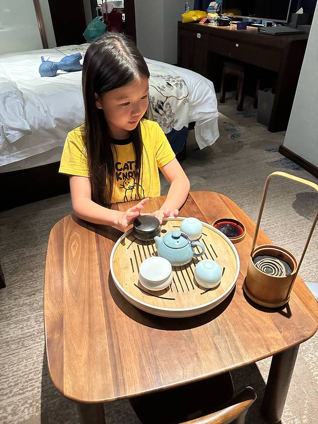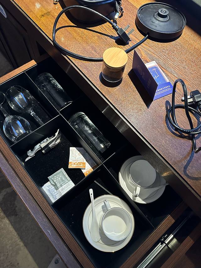 房间免费提供茶叶和茶具,咖啡粉和咖啡壶,首次入住还有迎宾水果,水果品质还可以,我们这次是烟台梨还挺甜的,小苹果也是脆甜。