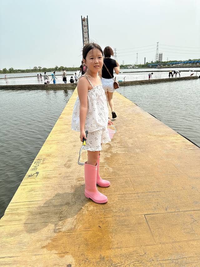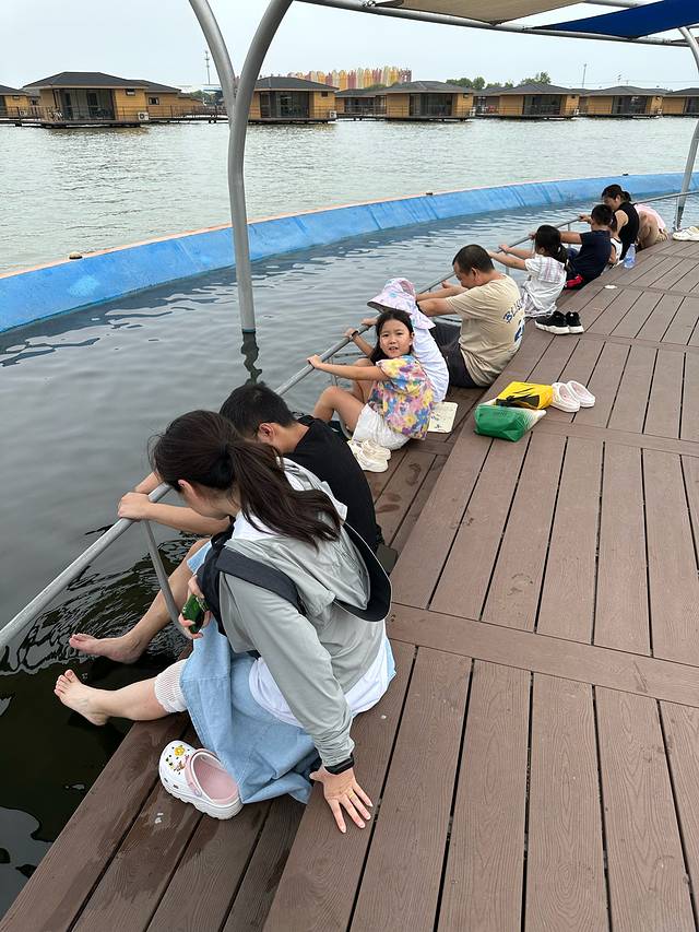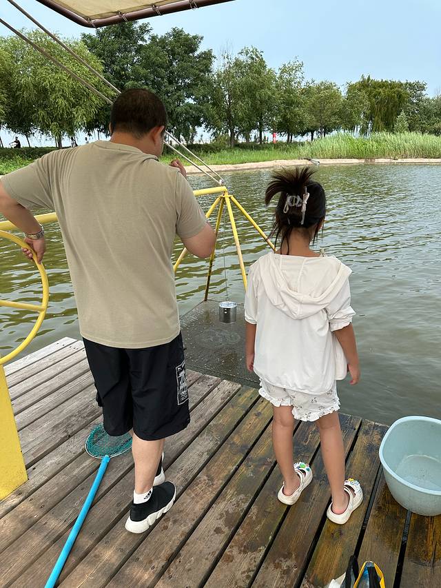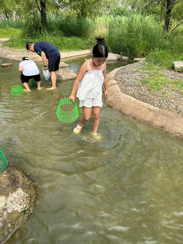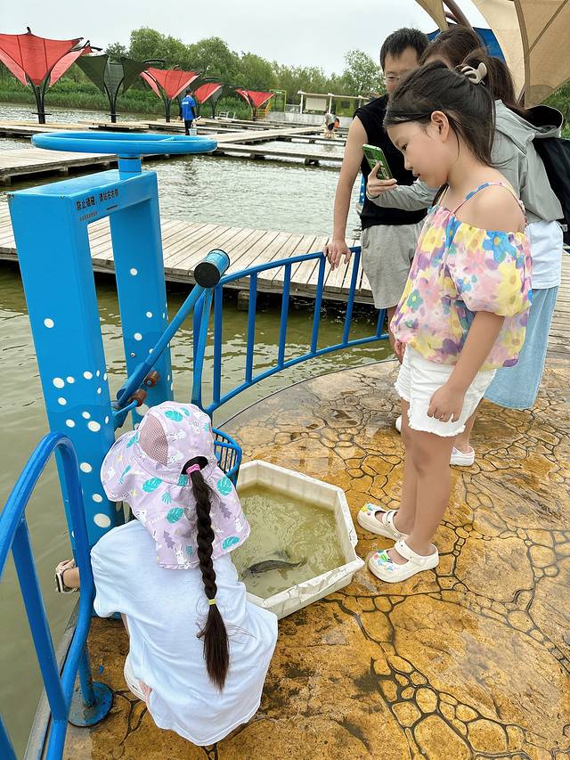 从湿地风光那边出来就准备离园了,等朋友的功夫又去体验了一下钓螃蟹。入口处工作人员会提供一个钓竿,上面绑着一条小鱼,把小鱼放入水中就会有小螃蟹来吃,可是他们的力气太大了鱼竿一定要拿住了。小螃蟹天天被钓可能也有了经验,每次都是在快出水的时候他们就放手了,鱼被吃掉不少可是螃蟹却不见上来……好在鱼饵可以没了再去要,都是一直免费提供的,如果不着急离开,这个项目也可以多玩一会,孩子们感兴趣!