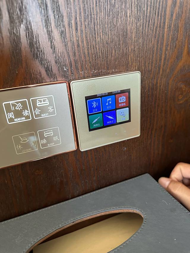 给我们换的这个房间配了蓝牙音响系统,可以连接手机播放音乐,音响在屋顶上,连厕所里都有音响,而且厕所的音响音量是可以单独控制的,洗澡的时候都可以享受音乐呢。