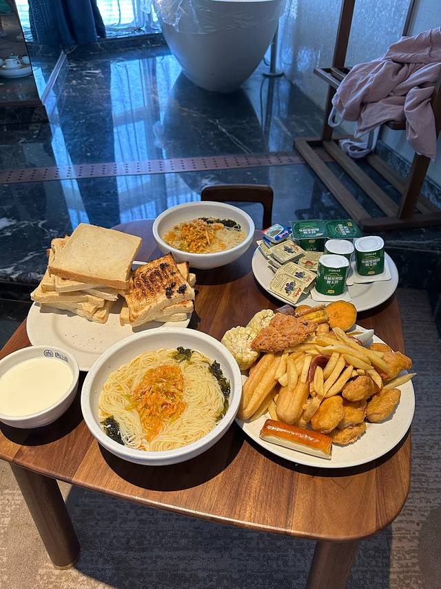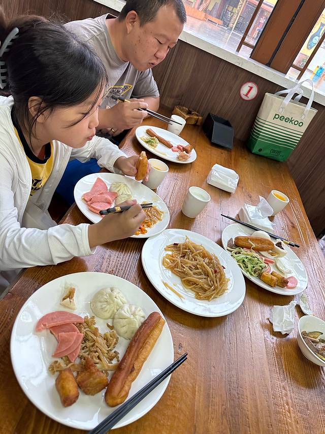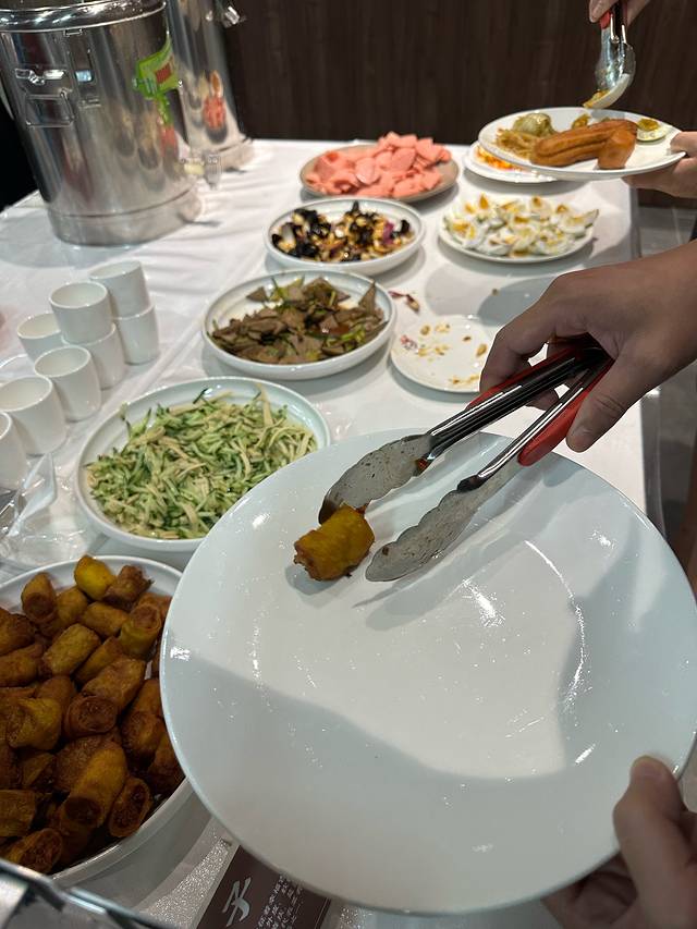 自助餐可以拿回房间那还真的挺……怎么说呢,合适?哈哈,毕竟我们还有三个人没有早餐,我俩端了四个盘子上楼,坐电梯的时候遇到了工作人员,工作人员还主动帮忙端送我们回房间。