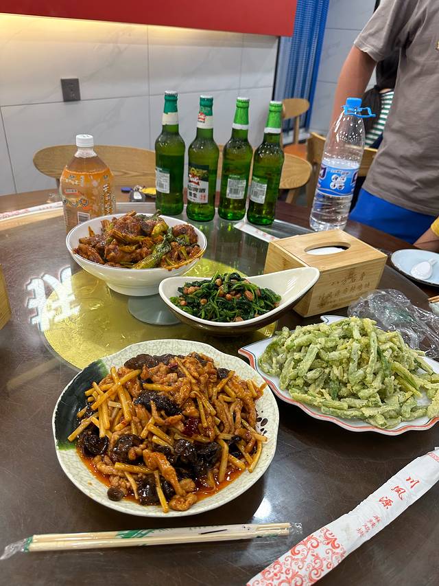 我们点了一个中份的麻辣鸡块,鱼香肉丝,鸭黄豆角、菠菜果仁和一碗酸辣汤。麻辣鸡块是甜辣口味的,小朋友也可以吃。鱼香肉丝就是下饭神器没毛病,其他两个菜下酒很好,酸辣汤有点太淡了感觉没放盐。6个人一共消费158(不包含酒水),整体吃的不错,尤其玩水以后吃点下饭菜喝点汤很舒服。