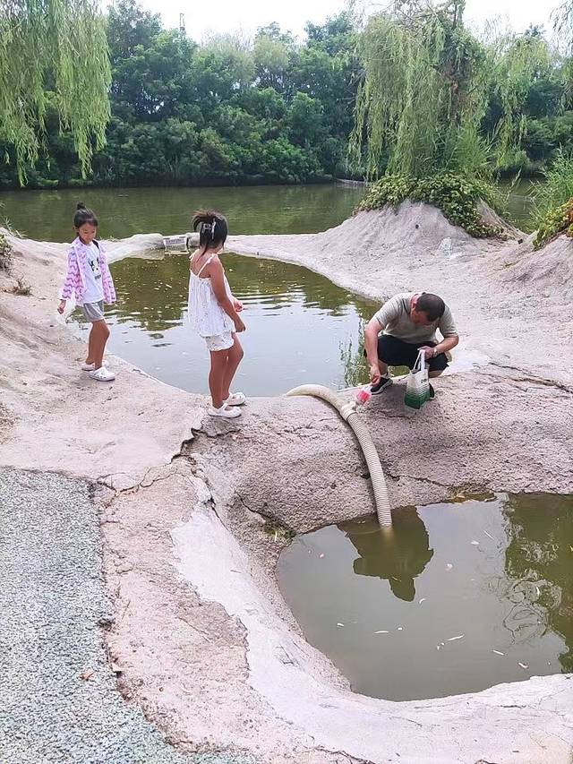 需要把池塘里的水先引入到另一个水池中,水落鱼出就可以享受捕鱼的快乐了!
