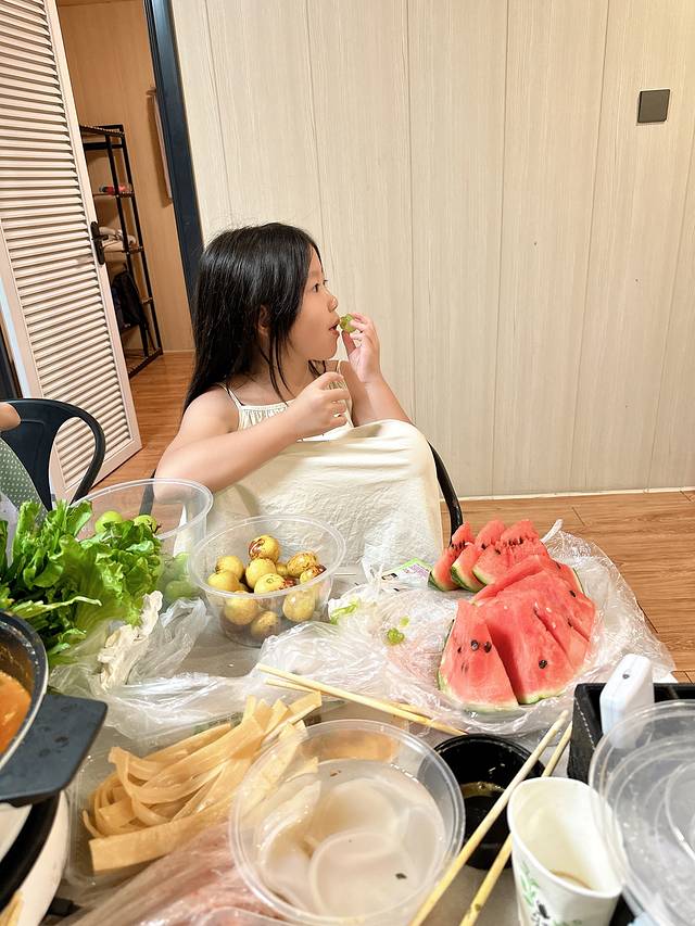 我们的火锅大餐要开始了,电磁炉鸳鸯锅,麻辣牛肉火锅底料,大宇火锅蘸料,羊肉,鱼丸虾丸各种丸类,还有牛蛙虾滑,蔬菜也有三四种呢,各种蘑菇,宽粉,豆皮等等。最主要的我们还有冰镇啤酒和饮料,还有水果呢!!可以说是相当齐全了!