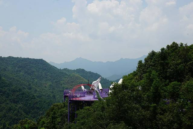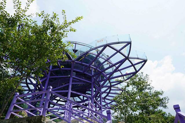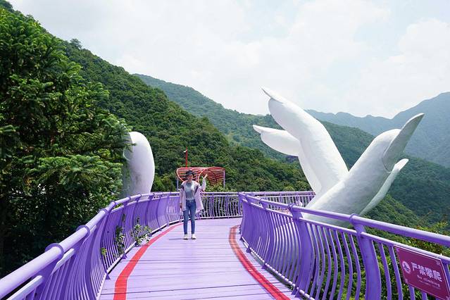 是一个突出的s形栈道,有好几只白色的手作为装饰,就好像仙人在半空中伸出的一双手,纤纤玉手甚是优美。紫色的栈道粉粉嫩嫩的,可以穿浅色的衣服来拍照,拍照真的很好看呀,有一种在五指山的感觉😬