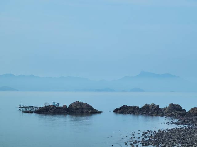 就是那片礁石海滩,早晨来的早,海面有一层薄薄的雾,增加了神秘感