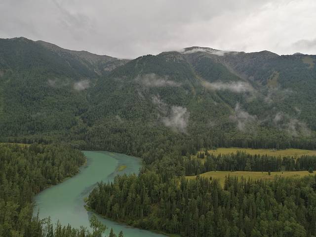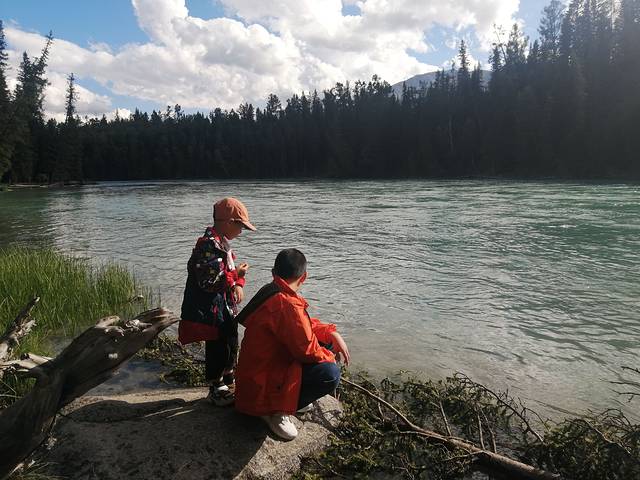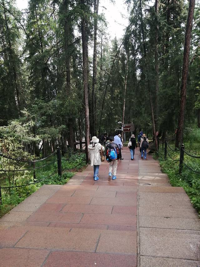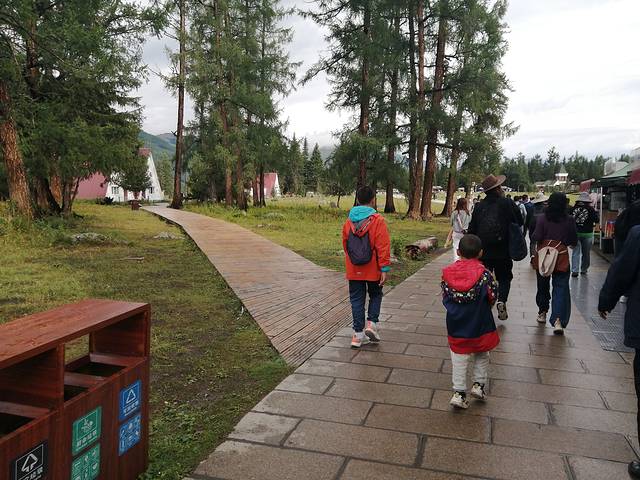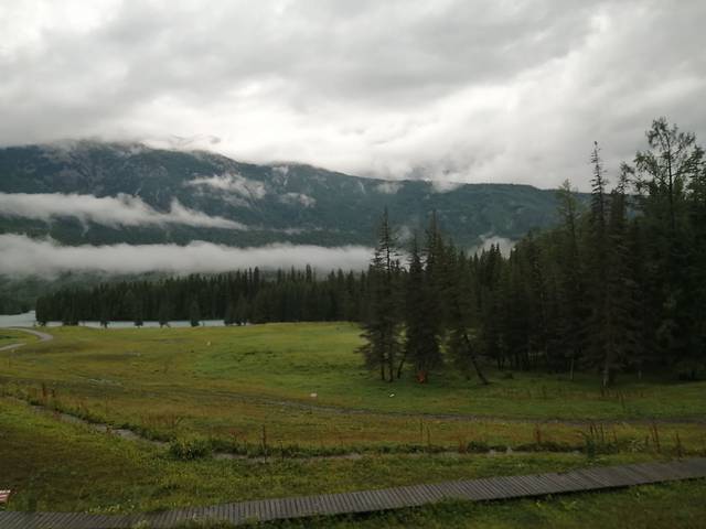 月亮湾。11号,喀纳斯下雨,好不容雨停了,我们坐摆渡车到神仙湾。然后走木栈道去月亮湾,中途又下雨了,被俩个小孩嫌弃死我了😂。徒步2.9公里到达月亮湾。后面的卧龙湾也没去了。转乘点有卖一次性雨鞋,雨衣,25-50元不等。建议大家自己在网上买了带上。
