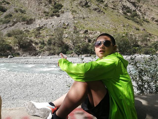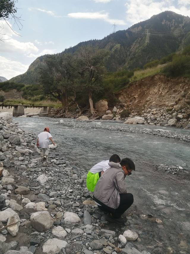 车行一百多公里,进去了天山山脉。车一会儿沿河谷前行,一会儿绕山爬行。我们9点出发,行至这里已经12点了。在河边野餐一小时,冰个西瓜,感觉跟好