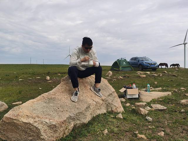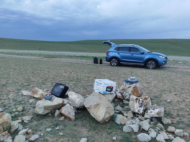 晚上在草原上露营。但是凌晨遭遇雷电暴雨冰雹,雷声雨滴声风声搞的一晚没睡。露营选址注意事项:1.不会积水的高地,避免坑洼的地方;2.背风;3.安静的地方。无论天气预报是晴天,也要做好夜晚下雨的未雨绸缪,防止积水、泥石流等。我看好每小时的天气是晴天多云,但还是做好了下雨的准备的。在内蒙天气预报基本不准,即使一小时前预报的一小时后也不一定靠谱。