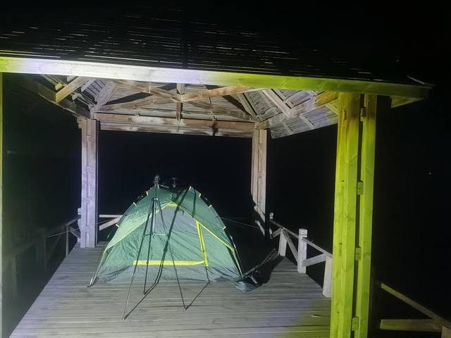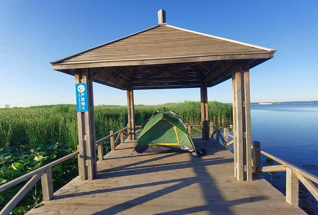 晚上在哈素海湖面的小亭子露营、看星空,在当地饭店吃湖里的鱼(我吃了三条大鲫鱼)。