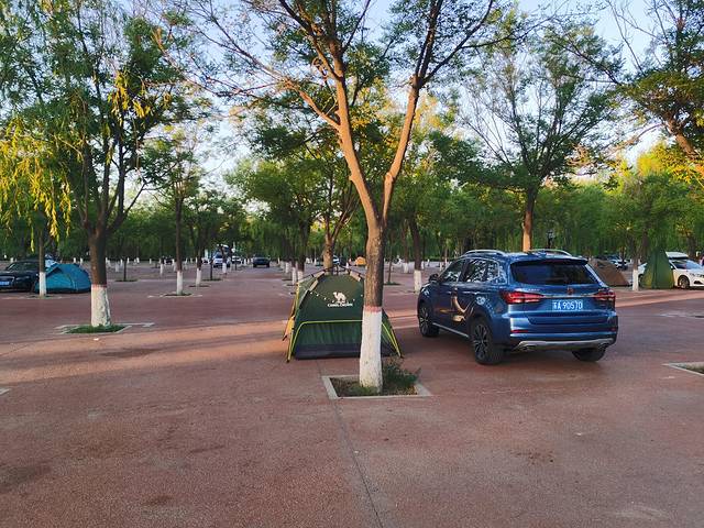 晚上在额济纳胡杨林景区门口广场露营,停车场也可以露营。